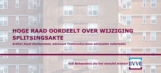 In een recent artikel van partneradvocaat Joost Donkersloot (TeekensKarstens advocaten notarissen) wordt beschreven hoe de Hoge Raad heeft geoordeeld over de wijziging van de splitsingsakte in appartementsrechten.